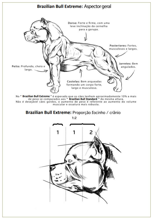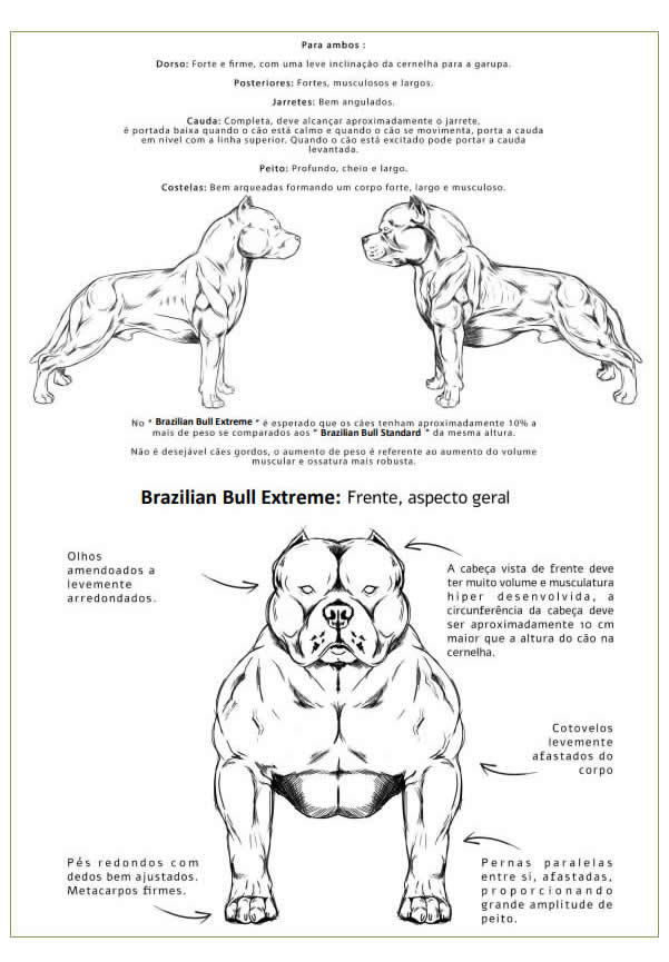 Altura e Peso: No “Brazilian Bull Extreme” é esperado que os cães tenham aproximadamente 10% a mais de peso se comparados aos “Brazilian Bull Standard” da mesma altura. Não é desejável cães gordos, o aumento de peso é referente ao aumento do volume muscular e ossatura mais robusta. Devem ser penalizados cães fracos, pouco volumosos ou de ossatura leve.