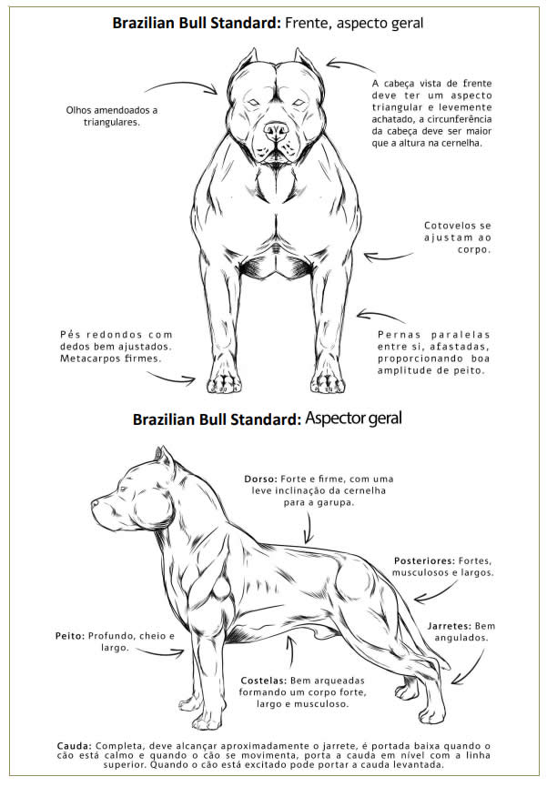 Descrição Geral: O “Brazilian Bull” ideal é um cão leal e amável; Como o nome sugere são cães que denotam grande força; Com uma cabeça grande e proporcional ao corpo musculoso, o “Brazilian Bull” deve possuir um dos físicos mais musculosos dentre as raças caninas, combinando resistência e força. O comportamento agressivo com seres humanos não é característico da raça, por tanto, extremamente indesejável.