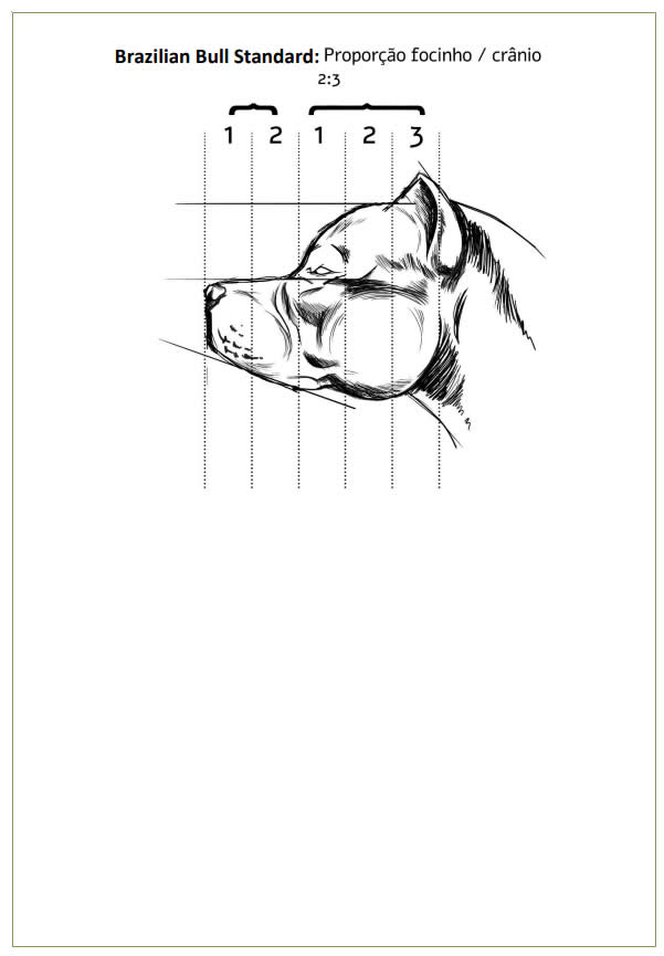 desenvolvida. Devido a hipertrofia da musculatura da região frontal do crânio o sulco medial se apresenta pronunciado entre os olhos. Quando vista de lado, o crânio e o focinho são paralelos entre si, unidos por um stop bem definido, em um ângulo entre 60 e 90 graus.